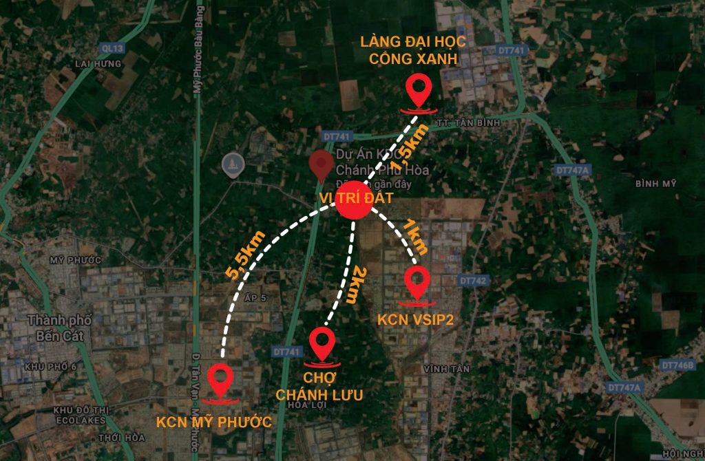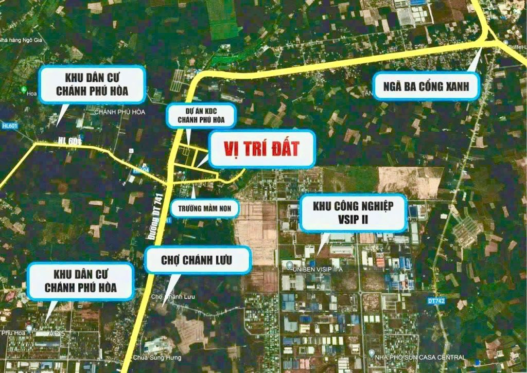 Nằm ngay đường Chánh Phú Hòa 007, chỉ cách Quốc lộ 14 đúng 80m, Đất nền trung tâm Chánh Phú Hòa – khu đất toạ lạc kề bên KCN VSIP 2 – khu công nghiệp lớn, quy hoạch đồng bộ và đang mở rộng mạnh mẽ.